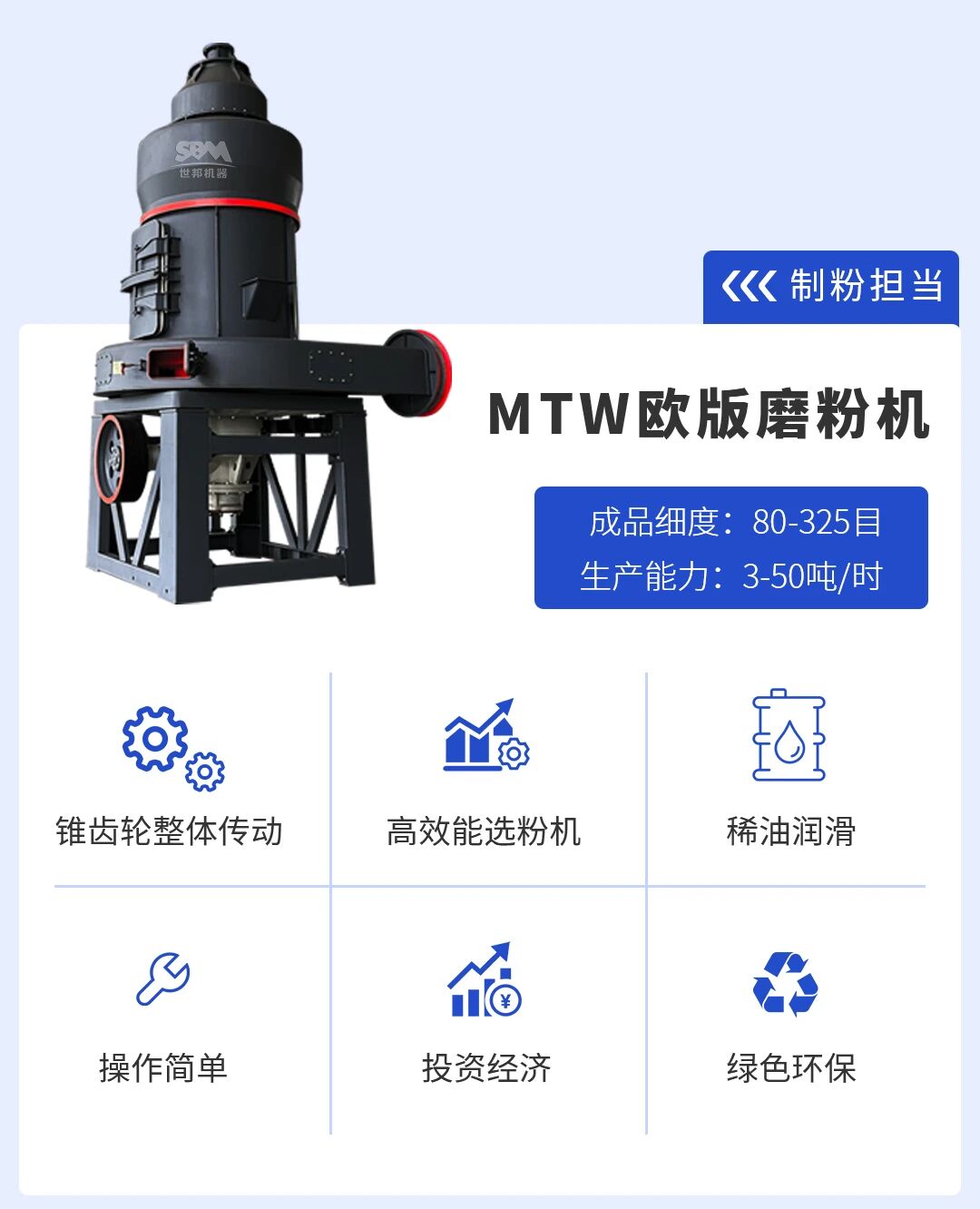針對(duì)井陘石灰石高純度、質(zhì)地均勻的物料特性,以及客戶方對(duì)碳酸鈣在細(xì)度(325目)、白度、純度、粒度分布等方面的嚴(yán)苛要求,世邦選用深耕石灰石磨粉場景多年的MTW歐版磨粉機(jī)作為核心裝備,其多項(xiàng)技術(shù)優(yōu)勢(shì)精準(zhǔn)匹配高值化加工需求,為井陘石灰石打通“優(yōu)質(zhì)資源→高端產(chǎn)品”的轉(zhuǎn)化通道。